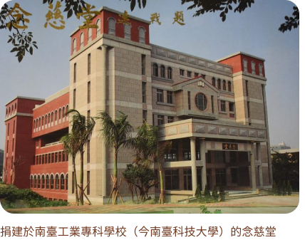 捐建念慈堂於「南臺工業專科學校」即今「南臺科技大學」,頂樓做為每年「全國大孝獎」頒獎地點。