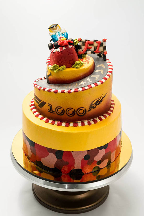 此次競賽作品,洪瑀襄同學以慶祝F1賽車第1000場賽事為設計主題,以其強悍的吹糖技術及創意,製作出象徵F1賽車比賽環繞世界的意象,並以令人驚豔的糖雕技術製作出賽車輪胎、賽車及賽車手,再以拉糖技術表現緞帶與花卉,製作出栩栩如生,色彩鮮艷的作品,更在柚子口味搭配規定的抹面基礎技術加入創意迷彩,在大蛋糕上層以蛋糕雕塑製作螺旋跑道,呈現出F1賽車現場熱烈歡呼等場景。